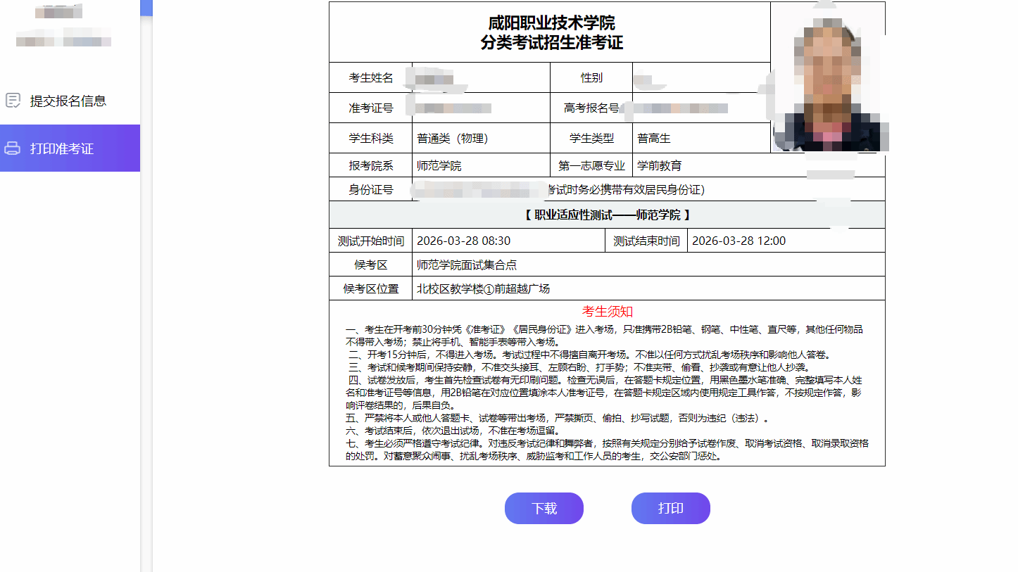 已完成专业志愿填报,提交专业报名信息的考生,可自行下载打印《准考证》。